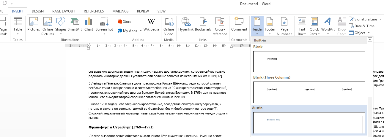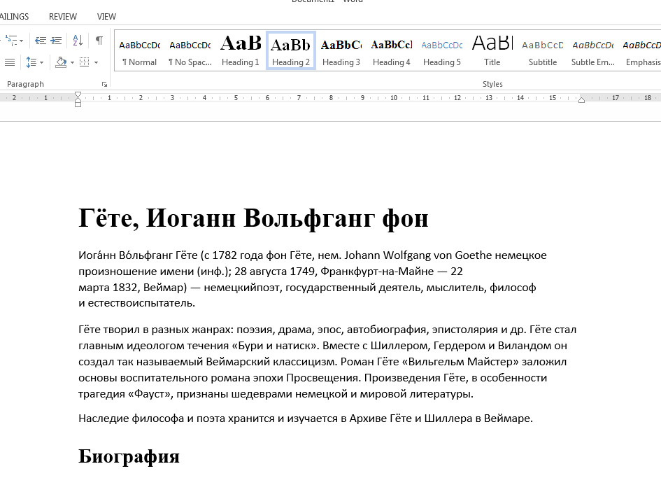 Чтобы автоматически создать обновление документа, нужно применить к его разделам стили заголовков. Например, заголовок "Гёте, Иоганн Вольфганг фон" -- самый главный в нашем документе, поэтому к нему мы применим стиль "Заголовок 1" (это как одна решетка в Markdown, помните?). Заголовок следующего уровня ("Заголовок 2") -- "Биография", внутри этого раздела есть подразделы "Происхождение и детские годы" и "Учеба и первые стихи" ("Заголовок 3"), внутри последнего -- "Лейпциг" и "Франкфурт и Страсбург" ("Заголовок 4"). В общем, задача состоит в том, чтобы по очереди выделить все заголовки в вашей статье и применить к ним разные стили для создания иерархической структуры документа. Панель стилей находится на вкладке "Главная".