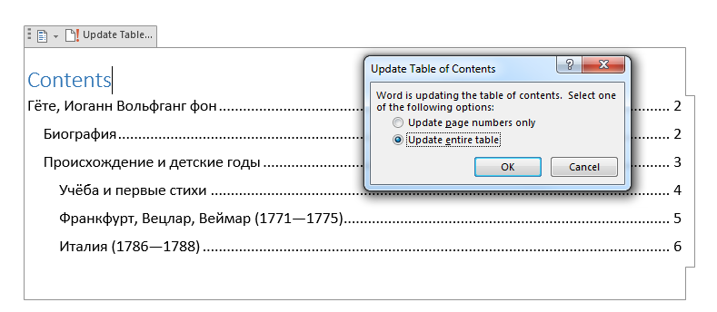 Если вы изменили статью, то нужно обновить оглавление, чтобы появились добавленные разделы и пересчитались номера страниц. Для этого нужно кликнуть мышкой по оглавлению и выбрать вариант обновления.