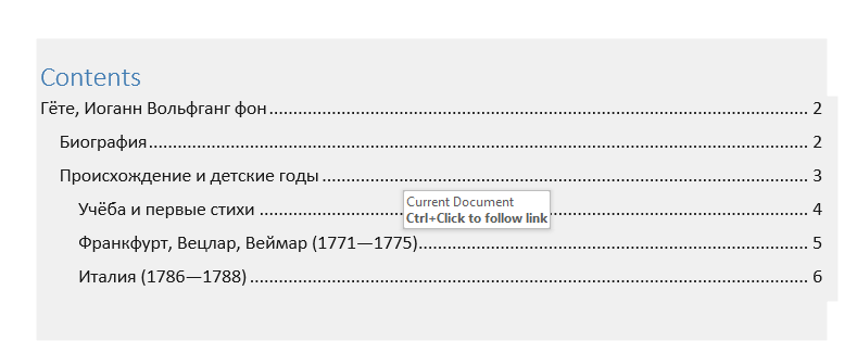 В таком оглавлении каждая строка будет ссылкой на соответствующий раздел текста: чтобы перейти по ссылке нужно кликнуть на нее с зажатой клавишей Ctrl.