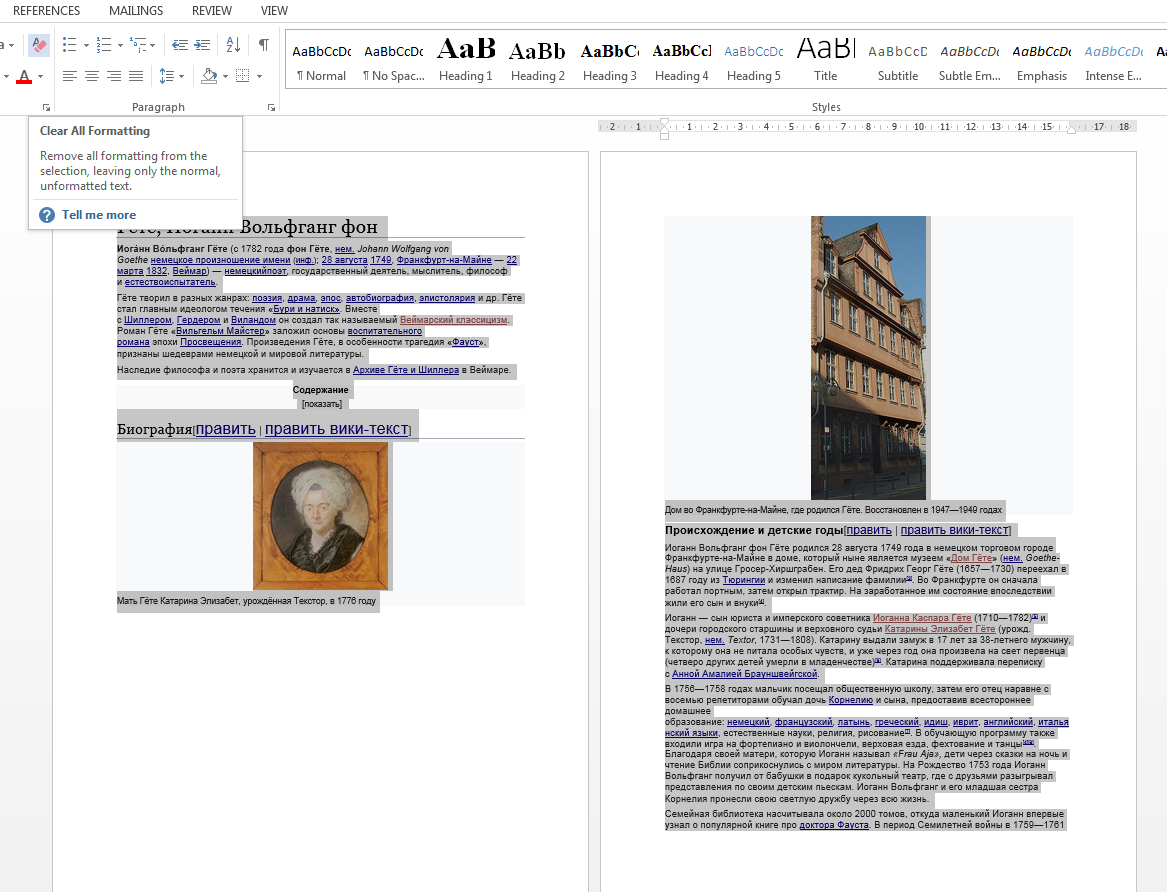 Теперь нужно создать пустой документ в MS Word и вставить туда скопированный текст. Это можно сделать с помощью сочетания клавиш Ctrl+V. Можно заметить, что при вставке сохранилось все форматирование исходного текста: выделение жирным шрифтом и курсивом, цвет текста, заголовки, выравнивание. Возможность форматирования текста -- одно из ключевых отличий текстовых процессоров вроде MS Word от простых текстовых редакторов вроде Notepad++ или Блокнота. Первое, что мы сделаем -- это сбросим форматирование Википедии, чтобы самостоятельно воссоздать его с нуля. Для этого нужно выделить весь текст (Ctrl+A), а затем нажать кнопку "Очистить форматирование" (буква А с ластиком) на панели инструментов вкладки Главная.