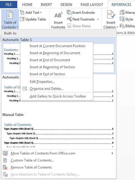 Далее нужно поставить курсор в начало только что созданной чистой страницы и на вкладке "Ссылки" выбрать "Оглавление > Автоматическое оглавление 1". Эта команда собирает все заголовки документа в таблицу (по умолчанию отображаются только заголовки до 3 уровня включительно) и автоматически проставляет страницы. Если вы хотите изменить параметры автособираемого оглавления, нужно выбрать настройки (Custom Table of Contents) в нижней части выпадающего меню. Кстати, еще один способ вставить оглавление -- щелкнуть по этому меню правой кнопкой мыши и выбрать место вставки.