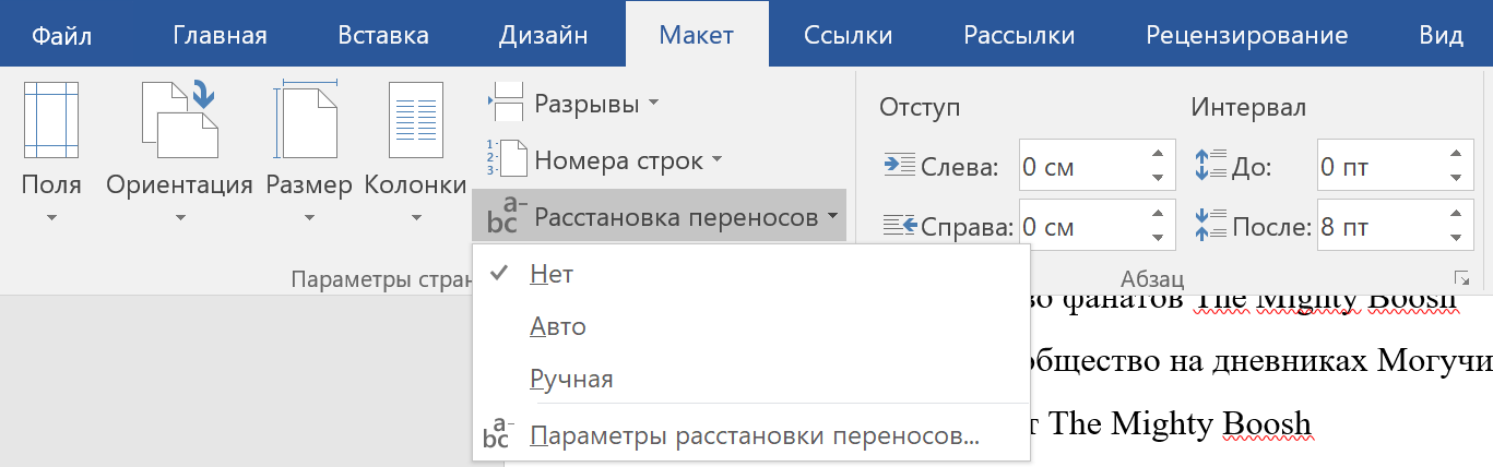 Во вкладке Макет можно настроить отступы и интервалы между абзацами, а также параметры расстановки переносов. Там же находится функционал, связанный с представлением текста в несколько колонок.
