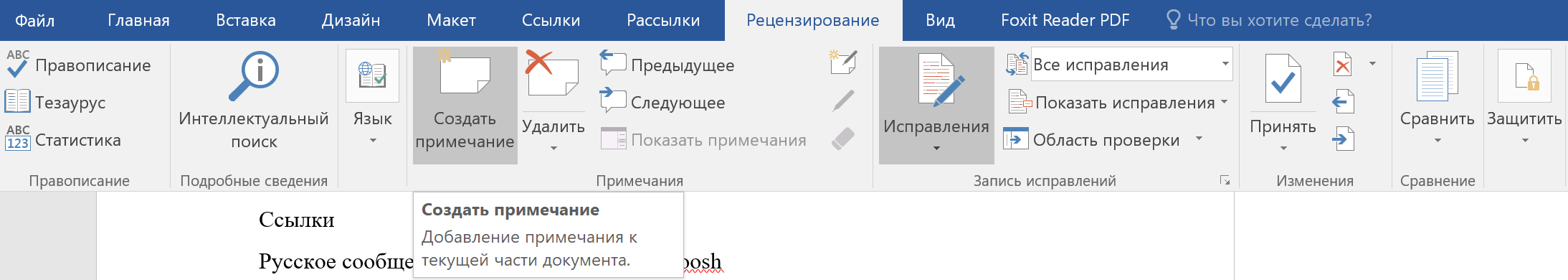 В некоторых случаях бывает необходимо внести правки поверх существующего текста (чтобы другой человек видел, что вы изменили в исходном тексте). Для этого выбираем Исправления во вкладке Рецензирование. В той же вкладке находится кнопка Создать примечание, которая позволяет оставлять комментарии к выделенной части текста.