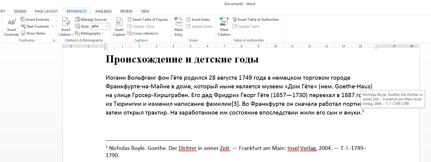 Кроме оглавления вро вкладке "Ссылки" находится еще один важный для написания любой работы инструмент -- сноски. Чтобы добавить постраничные сноски (текст сноски находится в нижней части той страницы, на которой стоит сноска), нужно выбрать "Ссылки > Вставить сноску" (Alt+Ctrl+F). Если навести курсор на сноску, то мы увидим ее текст во всплывающем окошке.