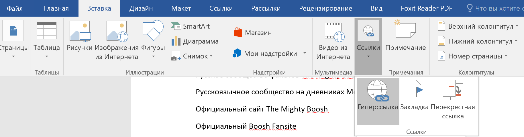 Внизу страницы находятся (гипер-)ссылки: когда мы очистили форматирование, они удалились. Давайте добавим, для этого скопируем URL, выделим нужное слово. В разделе Вставка выберем Ссылки, настроим необходимые параметры во всплывающем окне.